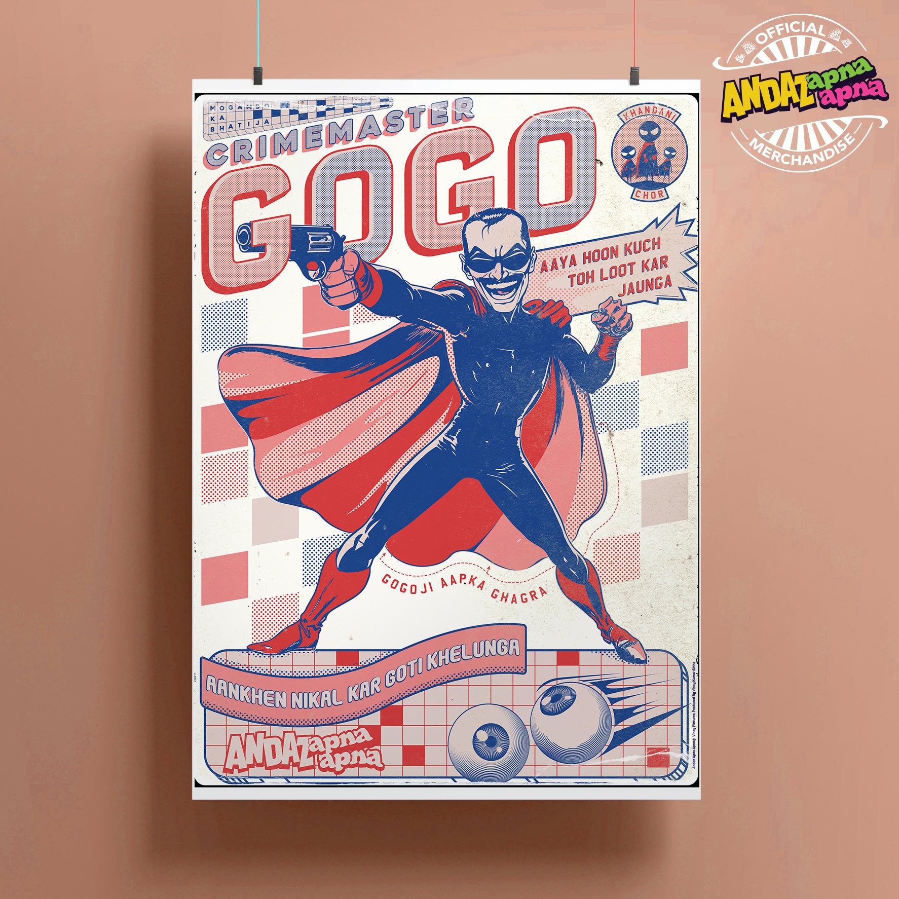 From his wild expressions to his over-the-top style, this poster celebrates the comedic genius of Gogo and his chaotic antics. Perfect for fans who appreciate the lighter side of crime (and classic Bollywood humor), this slice of nostalgia will remind you daily that crime doesn’t have to be serious business!