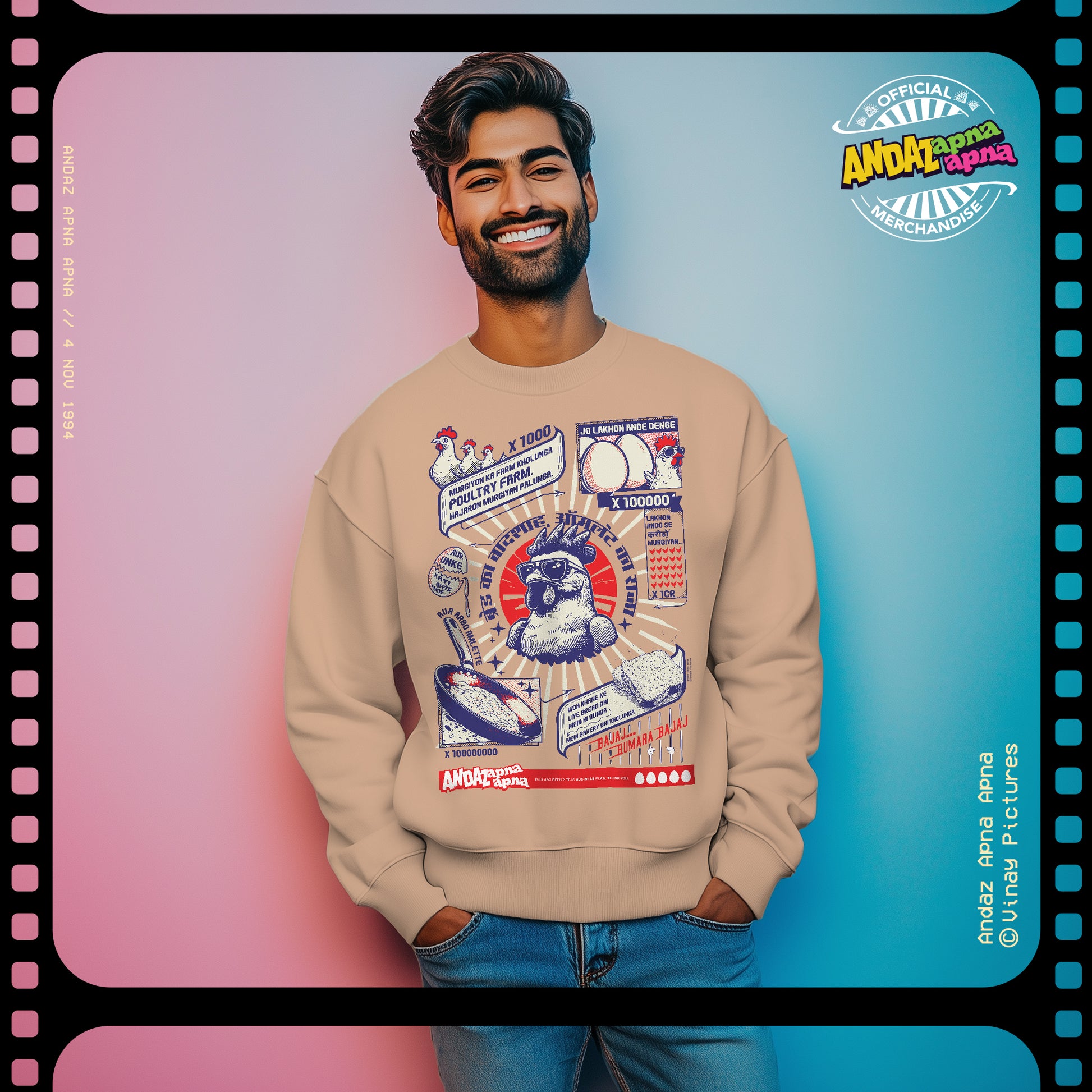 For all the fans of Andaz Apna Apna who remember Teja’s ambitious dream of opening a poultry farm, this coffee brown sweatshirt is here to bring that hilarious fantasy to life! With a comical graphic of Teja envisioning his very own chicken empire, complete with his iconic dialogues, this design is a loving (and laugh-inducing) tribute to Bollywood’s most unforgettable villain-in-the-making.