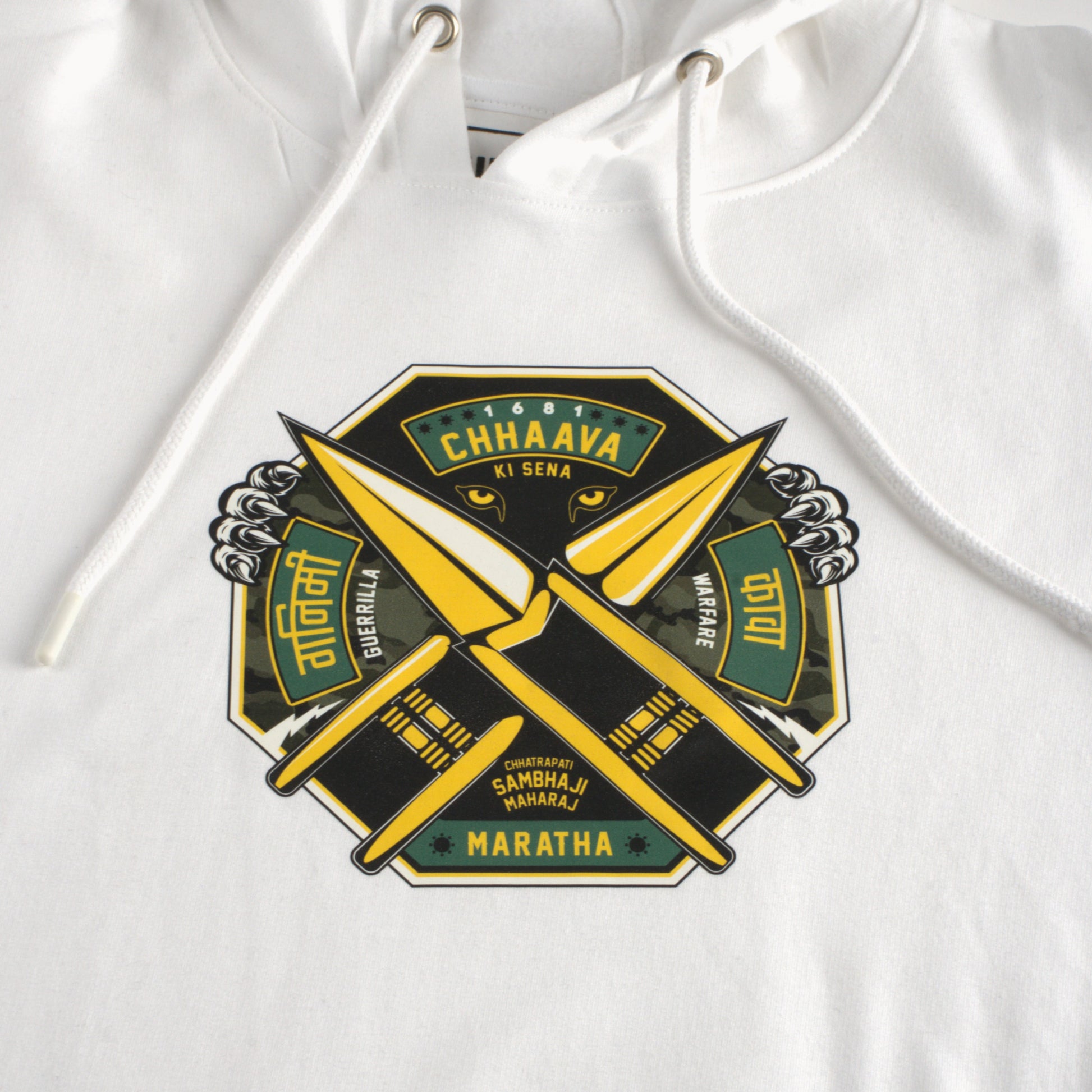 Step into history with the The Battle Shield Edit - White Hoodie, a powerful tribute to Chhatrapati Sambhaji Maharaj and his fearless army. This white hoodie features a striking shield emblem on the front, held by a roaring lion, symbolizing the indomitable spirit of the Maratha warriors.