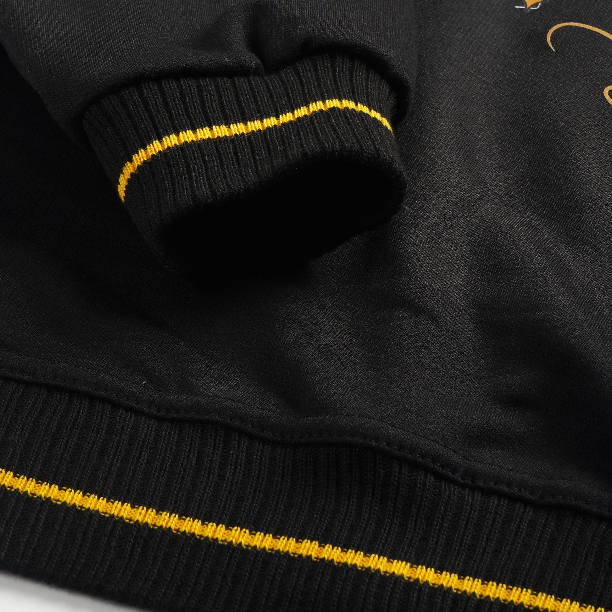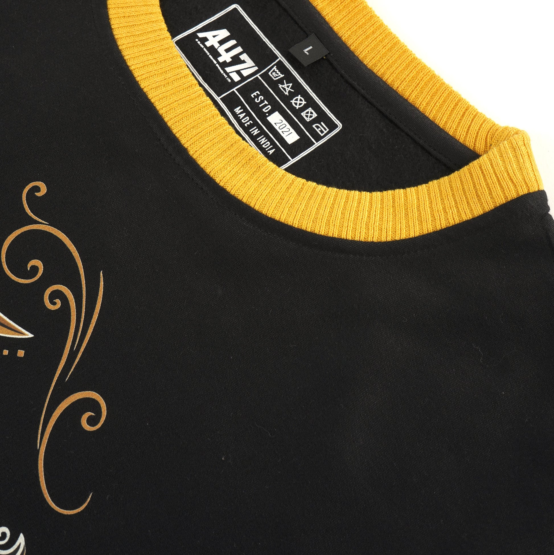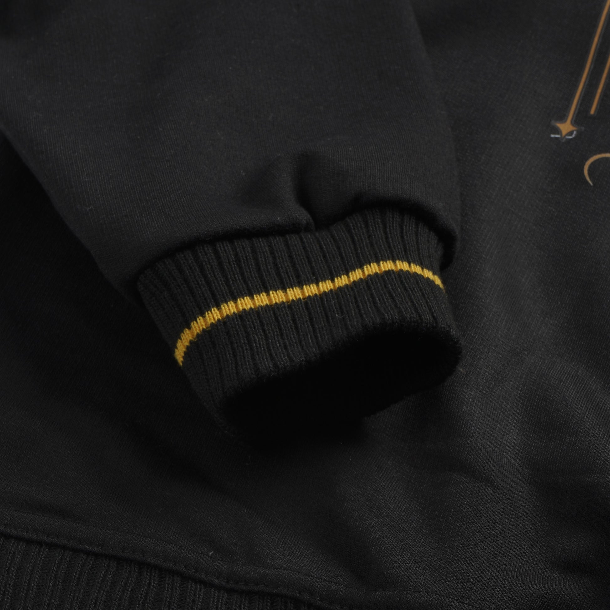 This black sweatshirt is designed with bold mustard ribs, symbolizing the warrior’s spirit and strength. The front features an intricate graphic, showcasing: