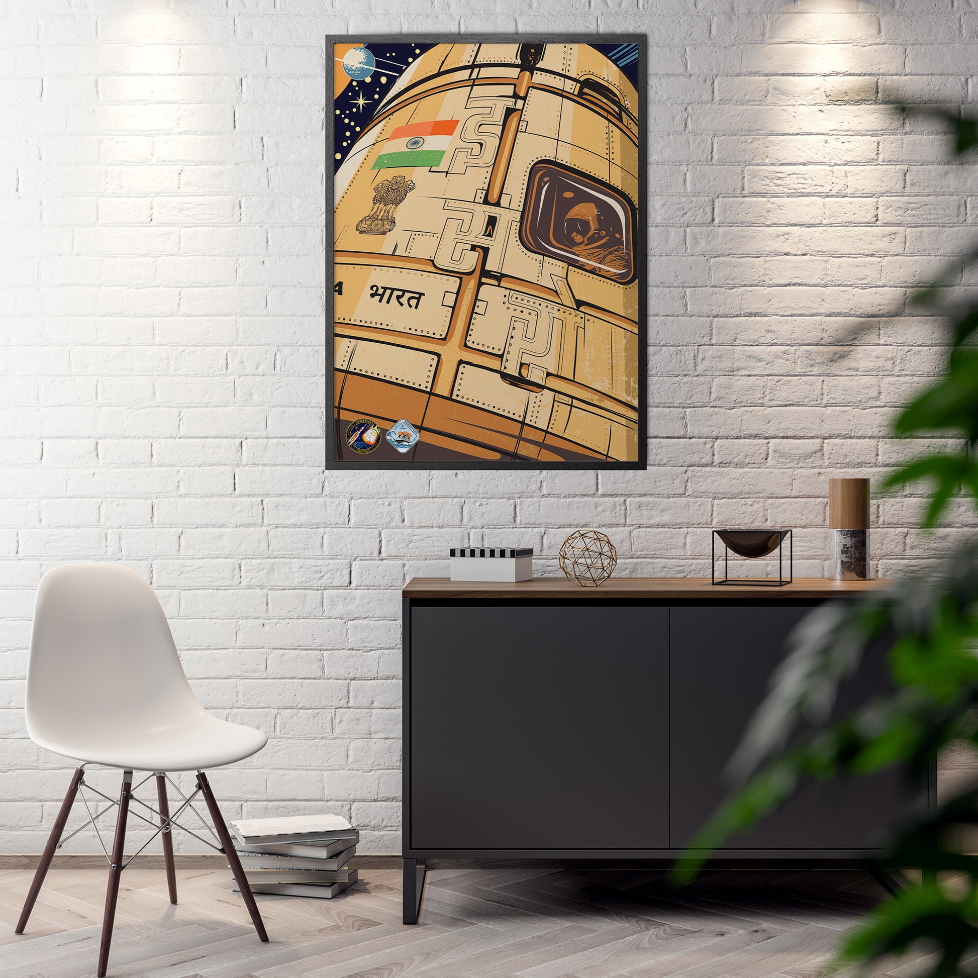 Gaganyaan represents a historic milestone for both ISRO and India, marking the inaugural journey of Indian astronauts aboard an indigenous crew module (H1) propelled by an Indian rocket (HLVM3). This venture mirrors the iconic moment akin to Neil Armstrong's lunar landing. The achievement is exceptional, as only a handful of nations have accomplished such a feat. Departing from our typical artistic style, the poster offers an intimate perspective, showcasing the crew module in orbit with a contemplative astronaut gazing through the window. This portrayal aims to underscore the gravity and risks inherent in the mission, emphasizing the imperative of ensuring the safe return of human travelers from space. Additionally, the poster includes the meticulously designed Gaganyaan mission patches, a testament to our pride in contributing to this historic endeavor.
