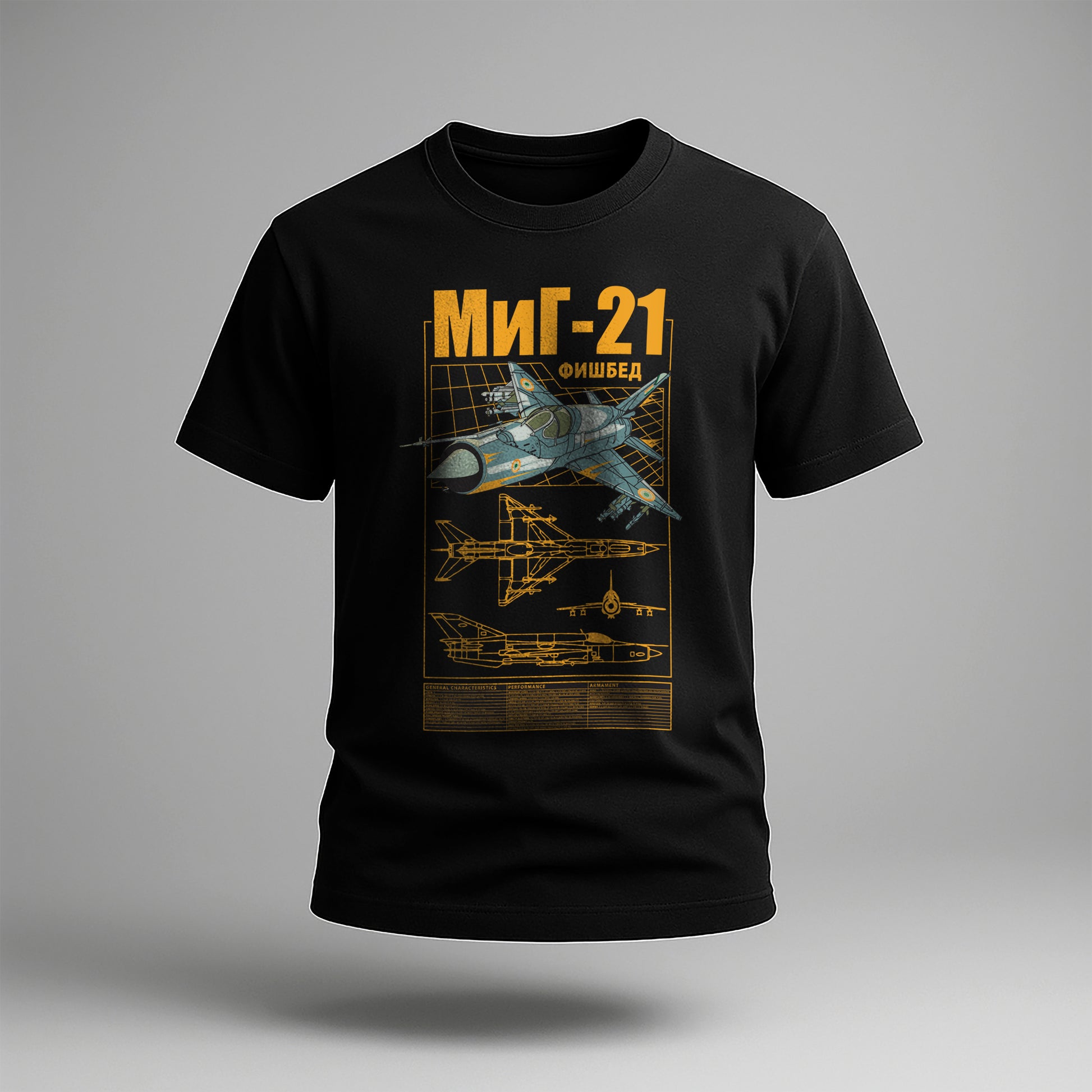The back and the front proudly features detailed schematics and artwork of the MiG-21 in a striking technical illustration style, complemented by bold Cyrillic text for an authentic tribute to its Soviet origins. Every line and diagram captures the engineering brilliance of this supersonic jet, making it a wearable piece of aviation history.