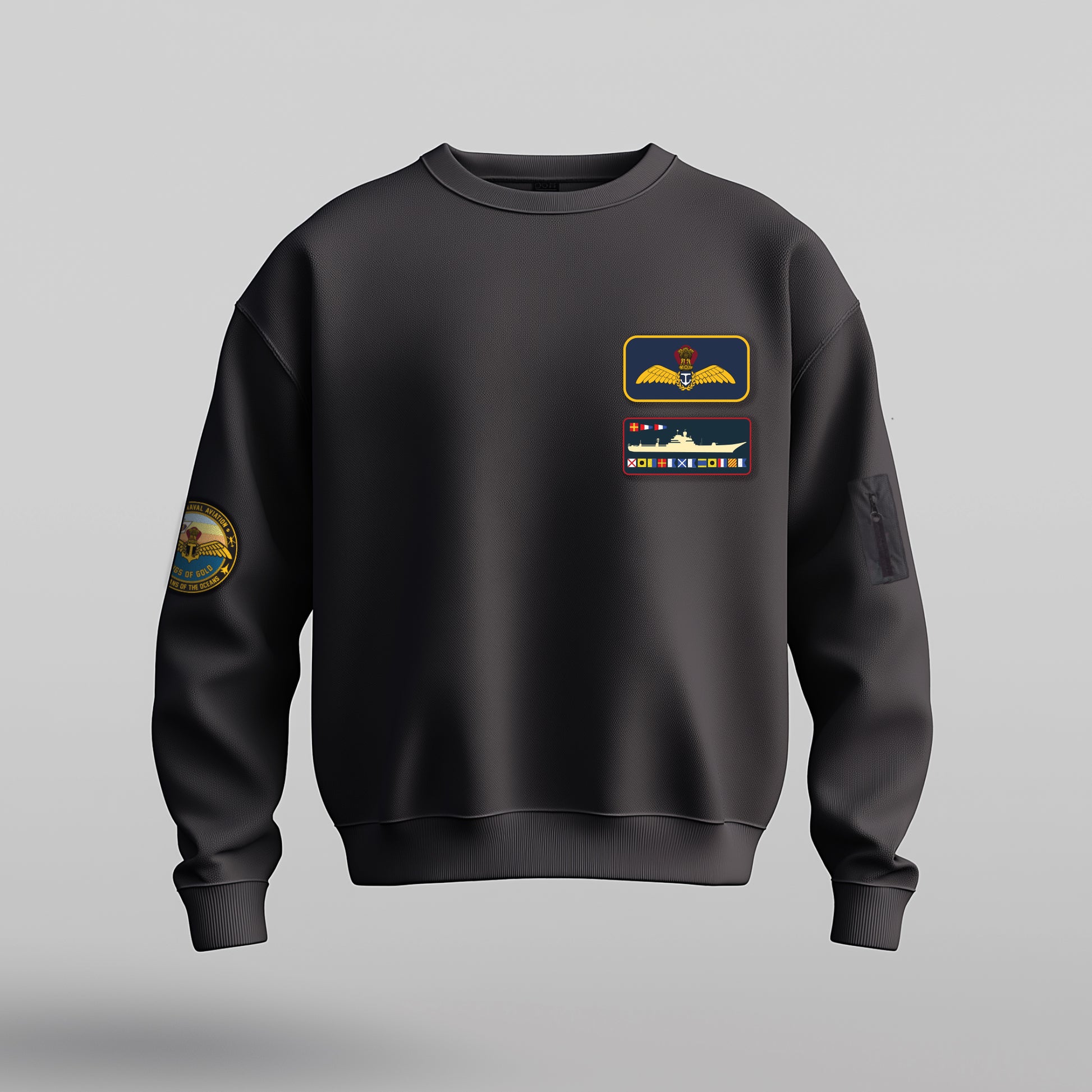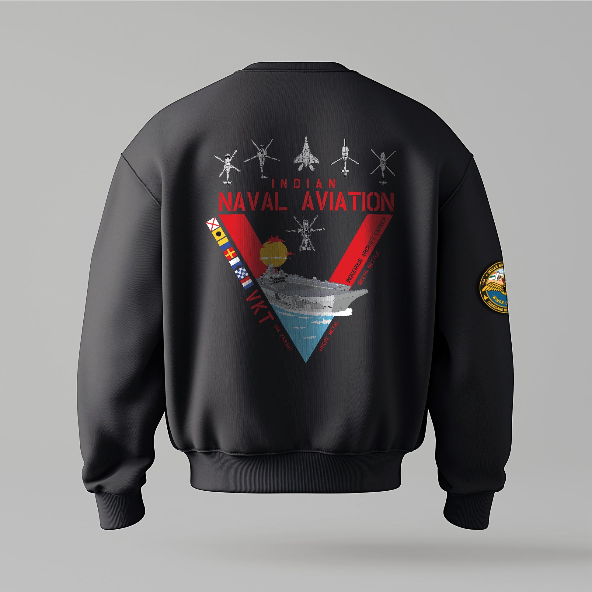 Complementing this is the "Indian Naval Aviation" typography, a naval signal flag arrangement, and the call sign "VKT," adding authenticity and depth to the design. This limited-edition sweatshirt is perfect for aviation enthusiasts, military supporters, and those who appreciate bold, statement-making apparel that represents strength, heritage, and pride in naval aviation
