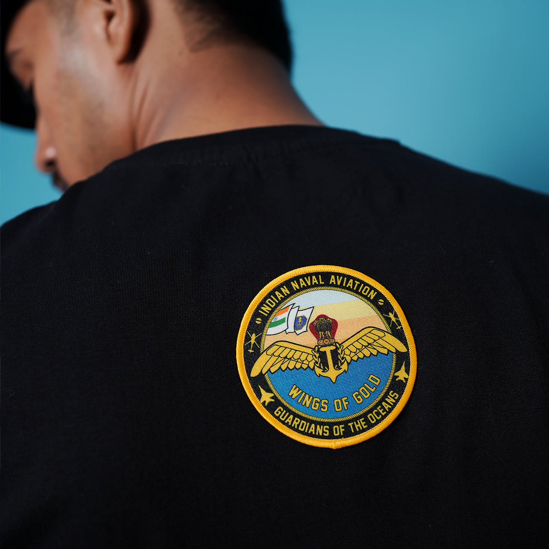 The front features a striking aircraft carrier graphic, symbolizing maritime power, along with bold "INDIAN NAVAL AVIATION" typography, squadron insignia, and badges that enhance its authenticity.