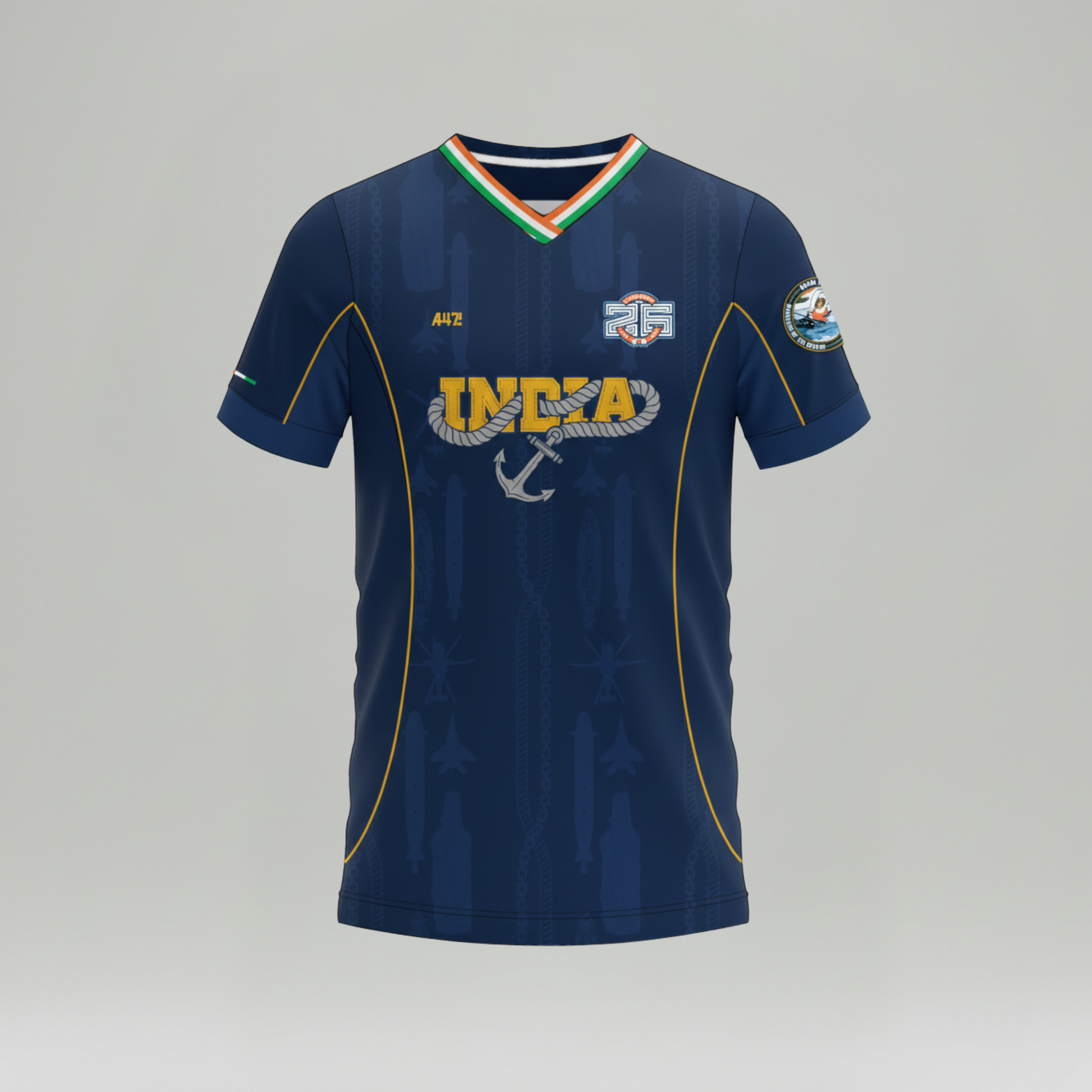 Crafted in a deep navy blue base, the jersey draws inspiration from naval discipline and sporting legacy. The rope-inspired typography, anchor insignia, and subtle military motifs echo the spirit of those who guard our shores, while the athletic silhouette and jersey detailing celebrate India’s cricketing culture — loud, passionate, and proudly worn.