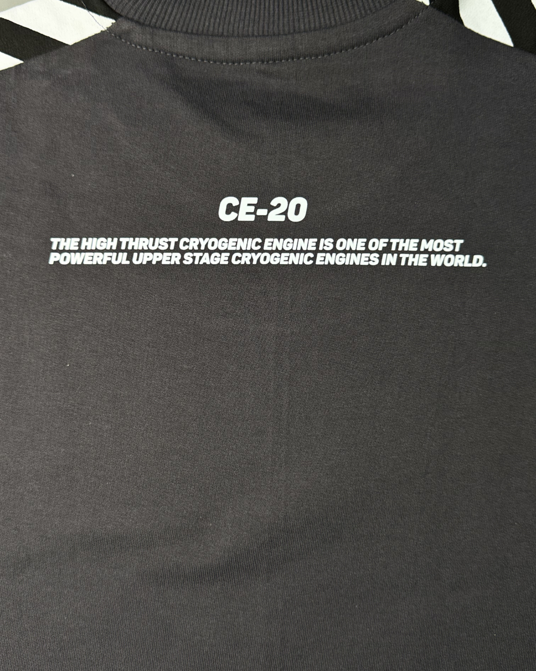 Elevate your wardrobe with the Official CE-20 Oversized T-Shirt in dark grey, designed for those who admire innovation and style. The front features a detailed print showcasing India's indigenous cryogenic engine and the GSLV Mk-III rocket, accompanied by a sleek additional graphic. The back highlights the "CE-20" emblem with the statement, "The high thrust cryogenic engine is one of the most powerful upper stage cryogenic engines in the world," celebrating a groundbreaking engineering feat. Contrasting striped panel details on the sleeves add a bold, modern flair to this oversized fit. Whether you're a space enthusiast or a fashion-forward individual, this tee is the perfect combination of comfort, inspiration, and cutting-edge design.