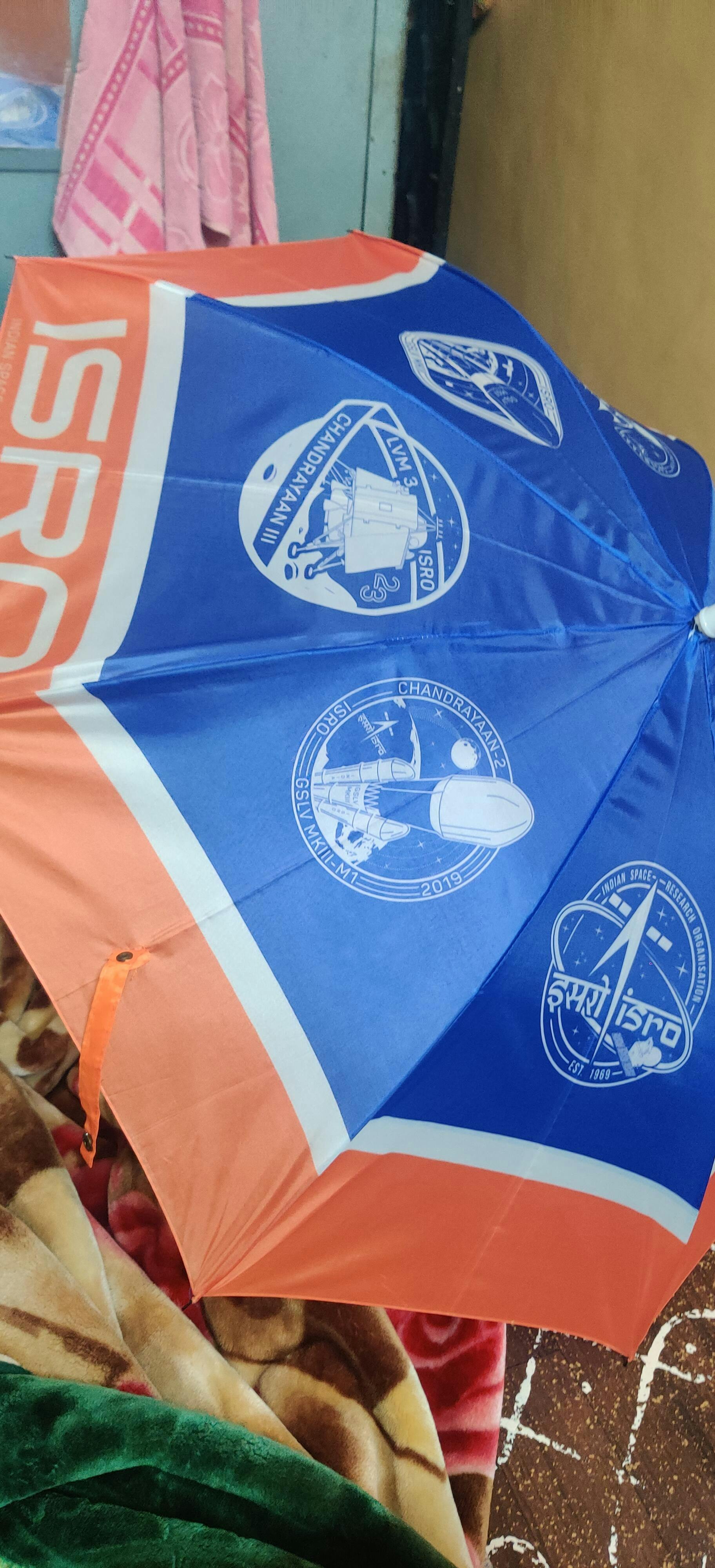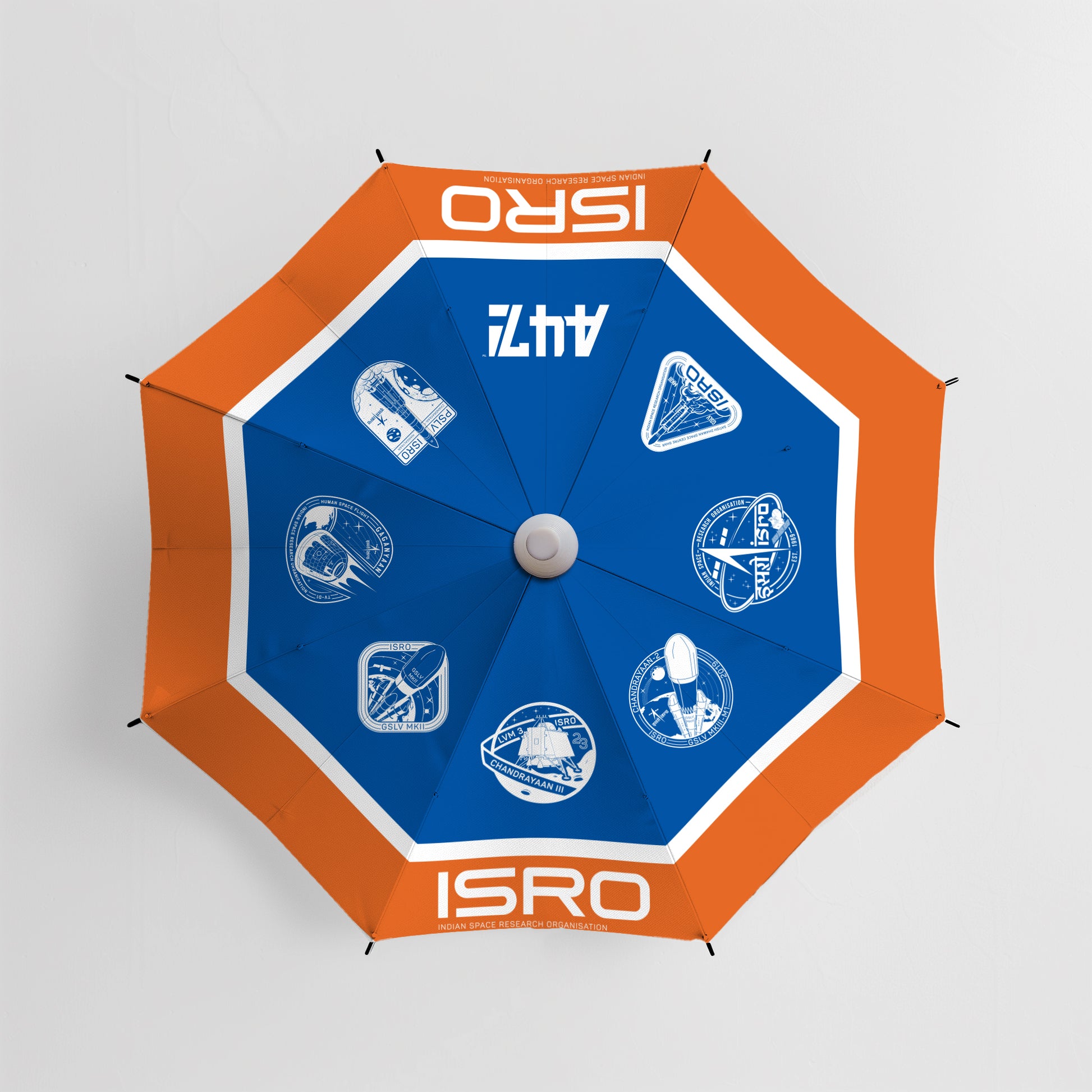 Embrace the spirit of space exploration with our ISRO-themed umbrella. This eye-catching umbrella features a vibrant blue canopy accented with thick orange borders, showcasing iconic ISRO missions in crisp white graphics. It's a perfect blend of style and tribute to India's space achievements.