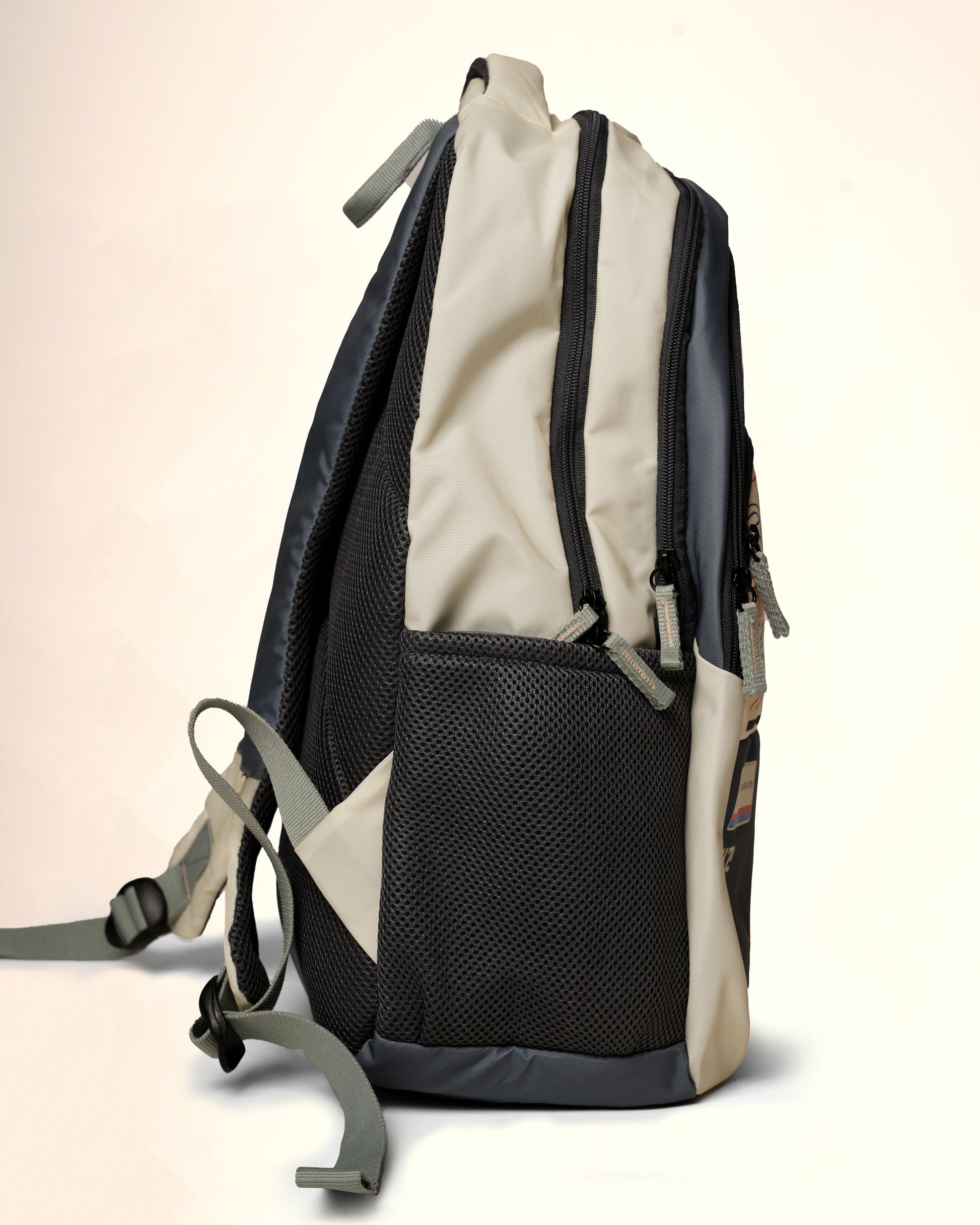 Introducing our Stellar Voyager Backpack- a blend of style, functionality and a passion for space exploration. This sophisticated yet playful backpack, featuring a harmonious combination of beige and grey tones, is perfect for young minds eager to embark on educational journeys. With prominent ISRO prints and a striking orange strap adorned with rocket designs, this backpack is a testament to both style and scientific curiosity.