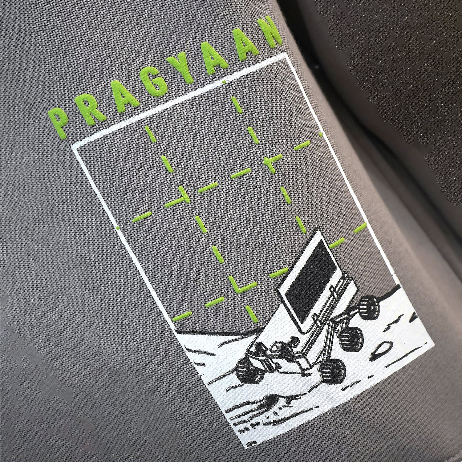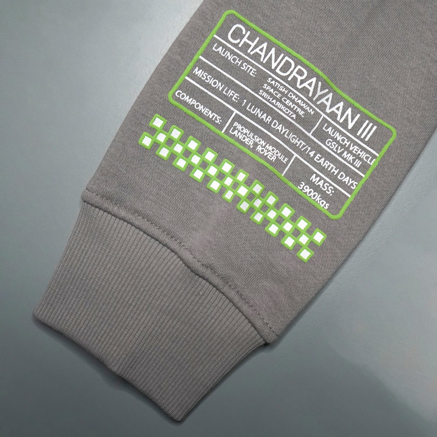 The back, subtly detailed with Pragyaan’s design on the lower right, completes this ode to exploration. The left sleeve showcases key mission details, making this hoodie a wearable story of triumph.