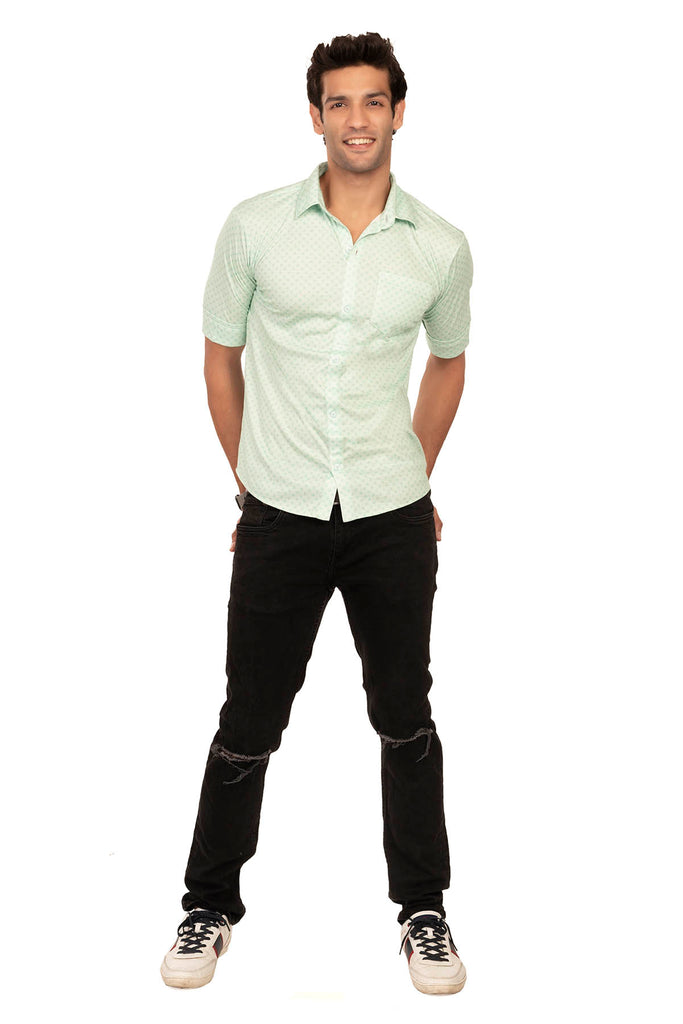 A soft pastel green complimented perfectly with a super subtle ditsy pattern. The perfect shirtee on a day you have a couple of concalls and not much else. Pairs perfectly with a pair of khaki chinos